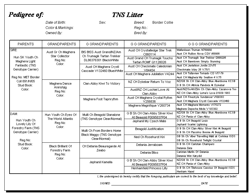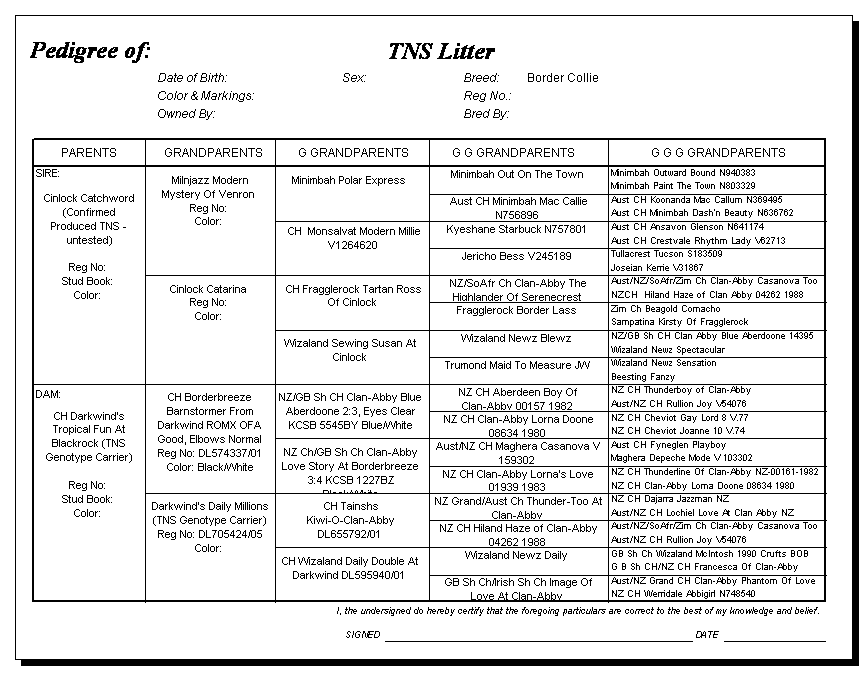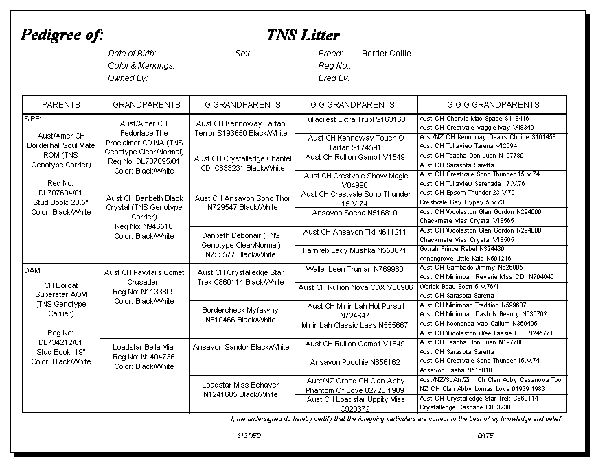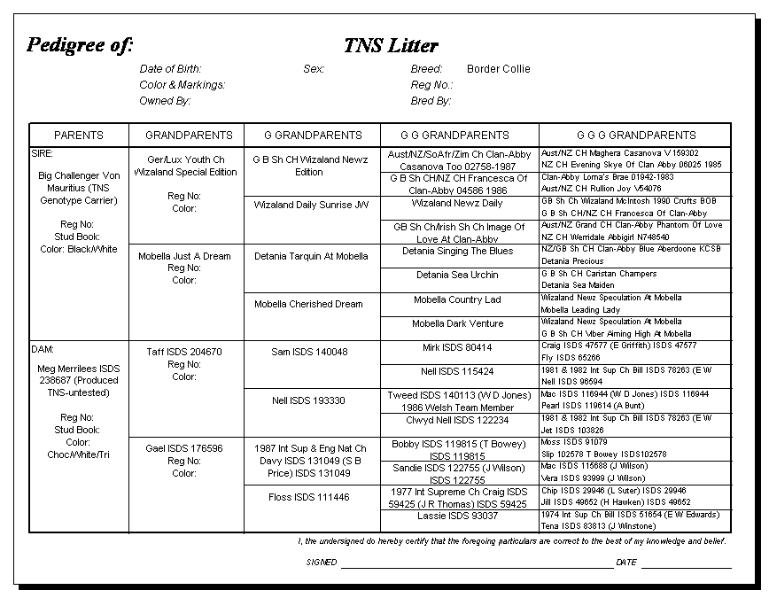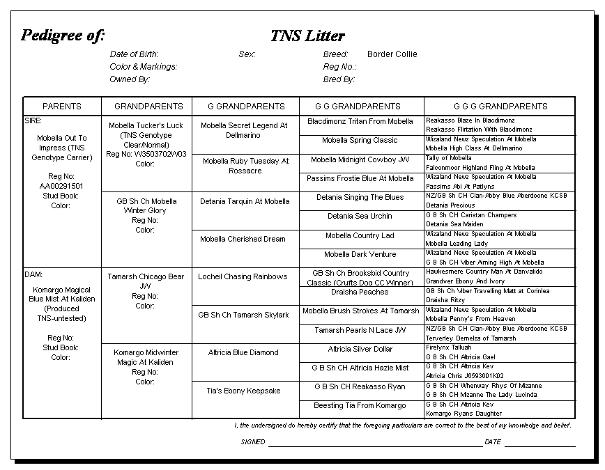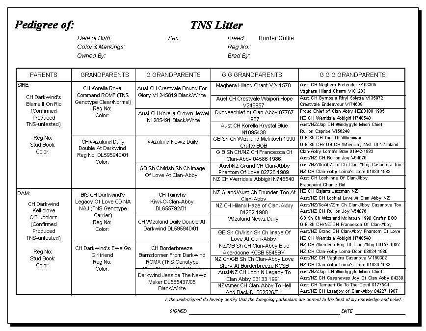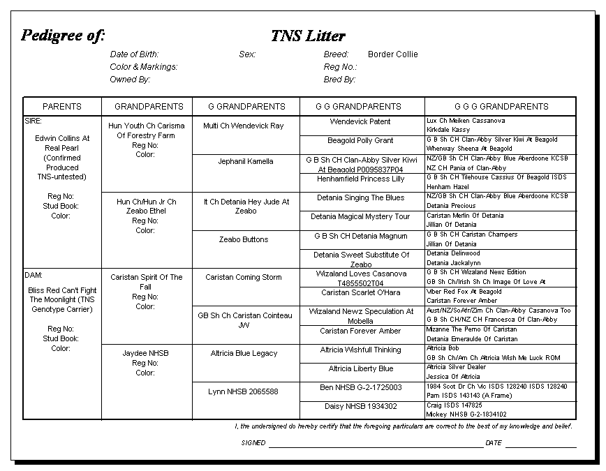 Following are pedigrees of litters that produced TNS or are suspected of having produced TNS.