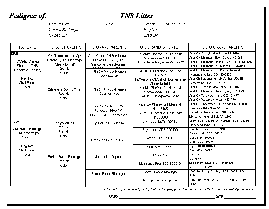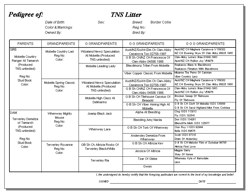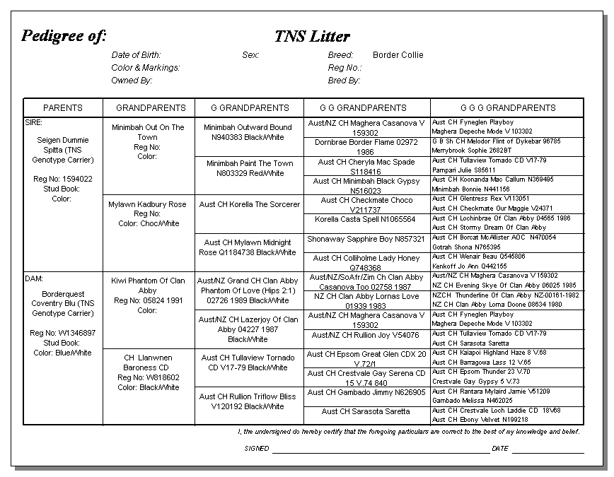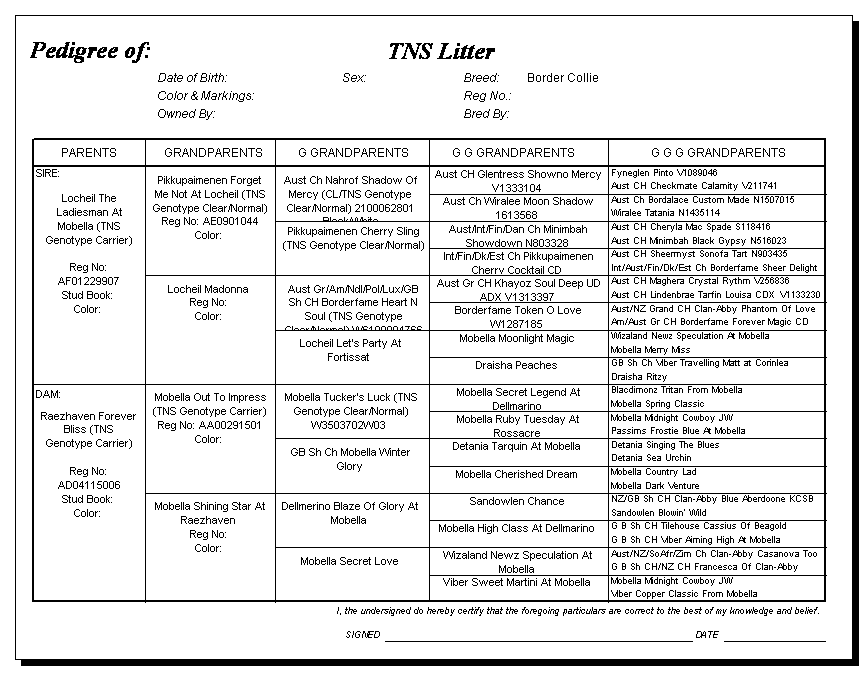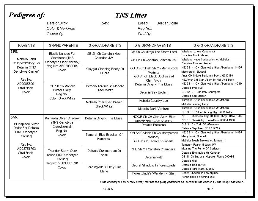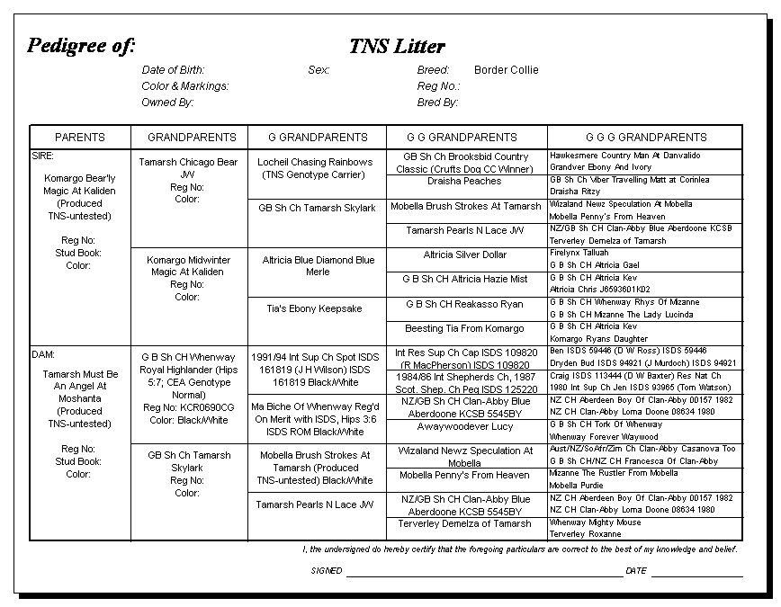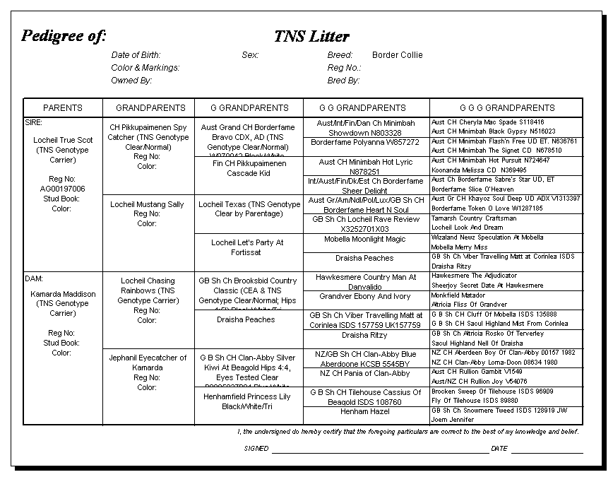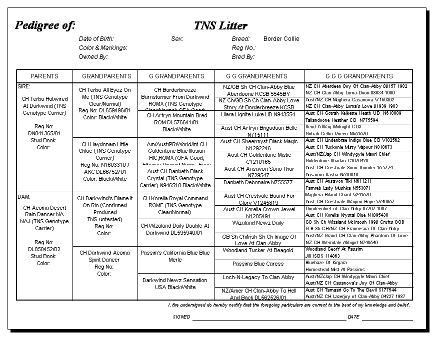 Following are pedigrees of litters that produced TNS or are suspected of having produced TNS.