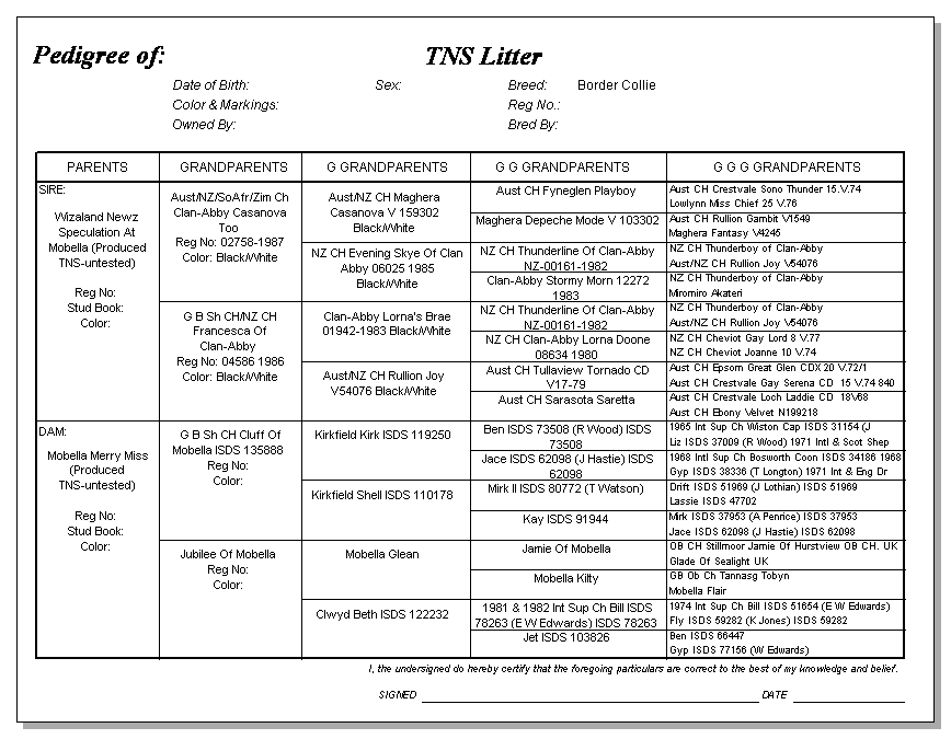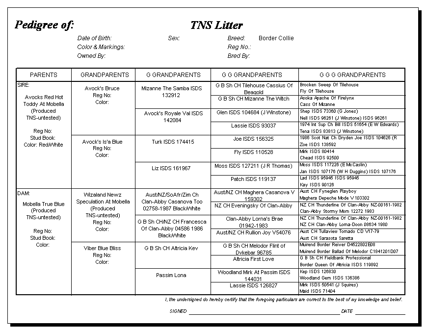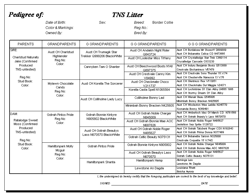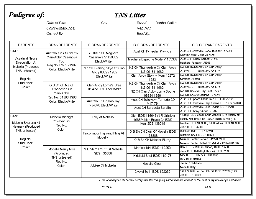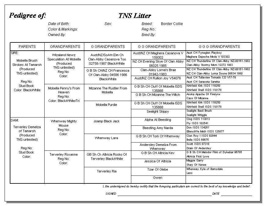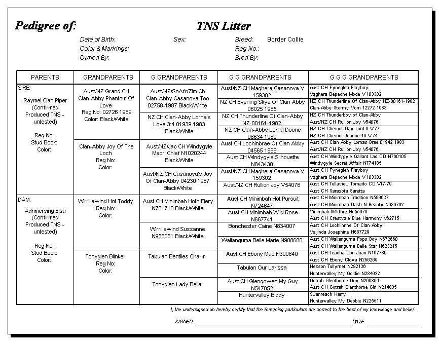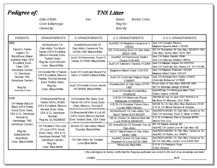 Following are pedigrees of litters that produced TNS or are suspected of having produced TNS.