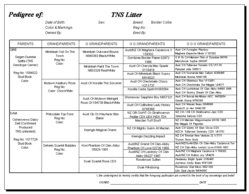 Currently Dr. Alan Wilton can only test for the chromosome that carries the TNS mutation in dogs related to known carriers. These pedigrees are provided as a service to help breeders determine if their dogs are eligible for the current test.